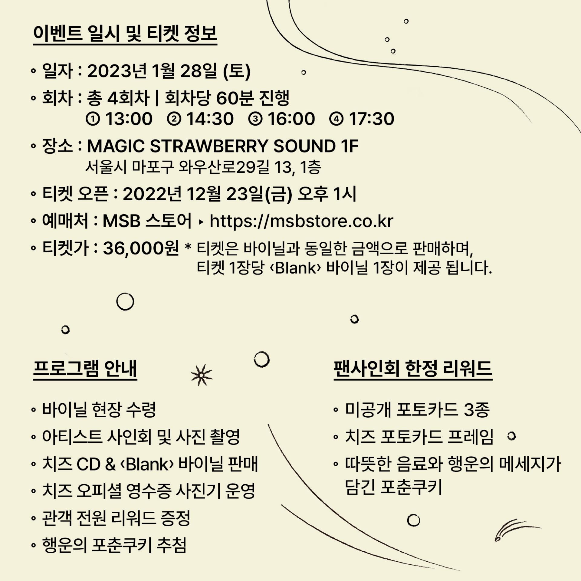 치즈의 EP [Blank] 바이닐 발매를 기념하여 사인회 및 팬분들에게 특별한 리워드를 제공하는 이벤트를 준비했습니다. 따뜻하고 오붓한 공간에서 치즈와 함께 바이닐 발매를 함께 기념해주세요!